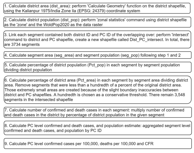 To generate the crosswalk between districts and parliamentary constituencies, we used a type of dasymetric mapping technique that allowed the weighting of the population in each PC assuming the COVID-19 metrics were distributed uniformly across the population in one district. See the workflow below and read the working paper here for more details.