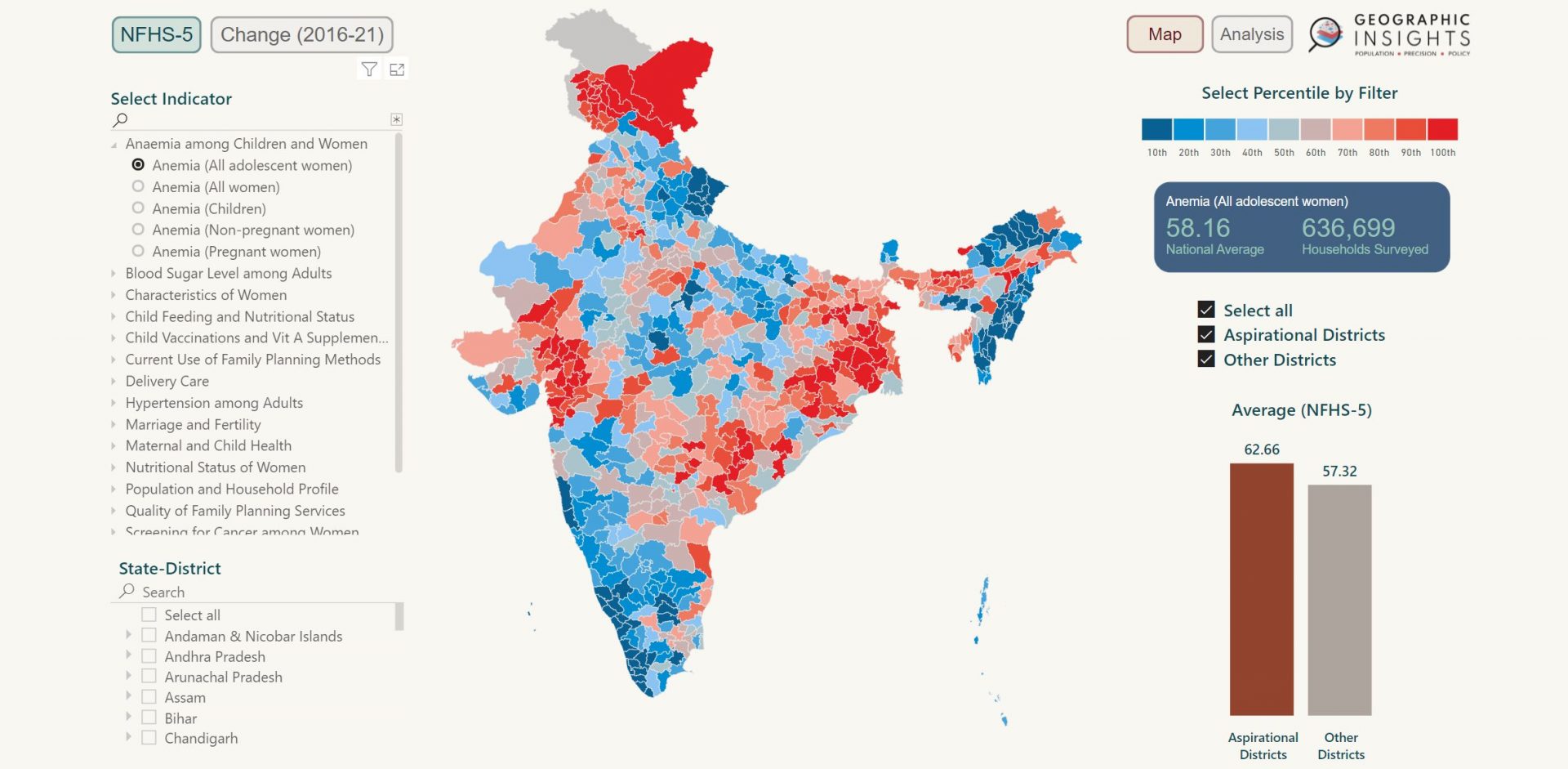 For a full screen view of the Geographic Visualization, see this link: https://geographicinsights.iq.harvard.edu/nfhs-tracker-districts-dashboard and for a full screen view of the Analysis, see this link: https://geographicinsights.iq.harvard.edu/nfhs-tracker-districts-analysis.